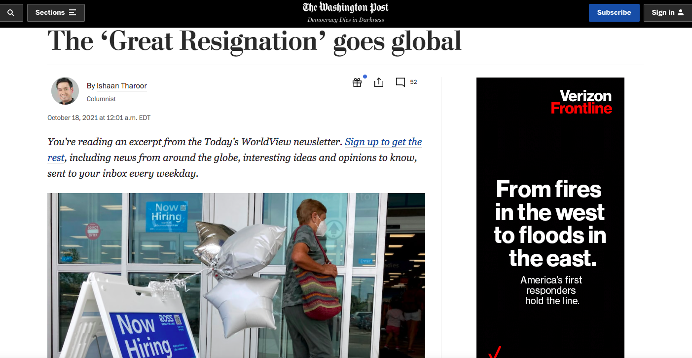 Source : le Whashigton post titre sur ce mouvement général de « Grande démission »